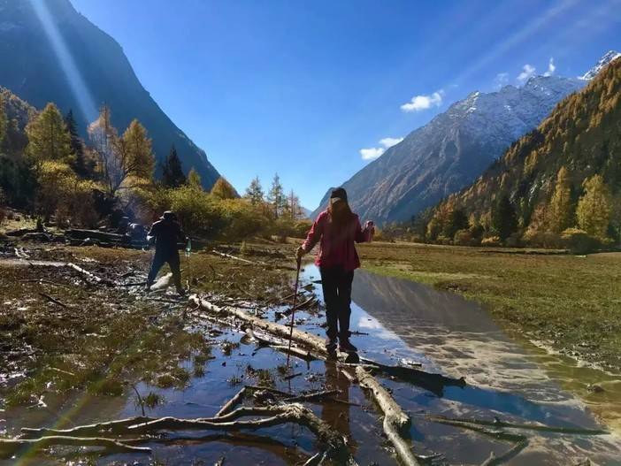 过山间的溪水时登山杖不仅可以支撑平衡,还可以探路 摄影/ K咖啡