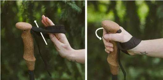 腕带的重要性不亚于登山杖本身。正确使用方法是:将腕带拿起来,手从腕带的下方穿入,将带子压在我们的手掌之中,然后再轻轻的抓住把手即可,透过腕带来支撑登山杖,而不是紧紧地抓着把手施力。