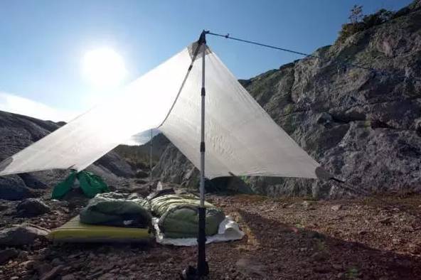 操作—— 将手中的登山杖固定在地上,以登山杖为中心,将地席或者衣服覆盖在上面。如果是结伴而行,可以集合大家的登山杖,与地席或衣服组合,搭建一个较大的休息区。雨来可避雨,无雨可遮阳,方便而实惠。