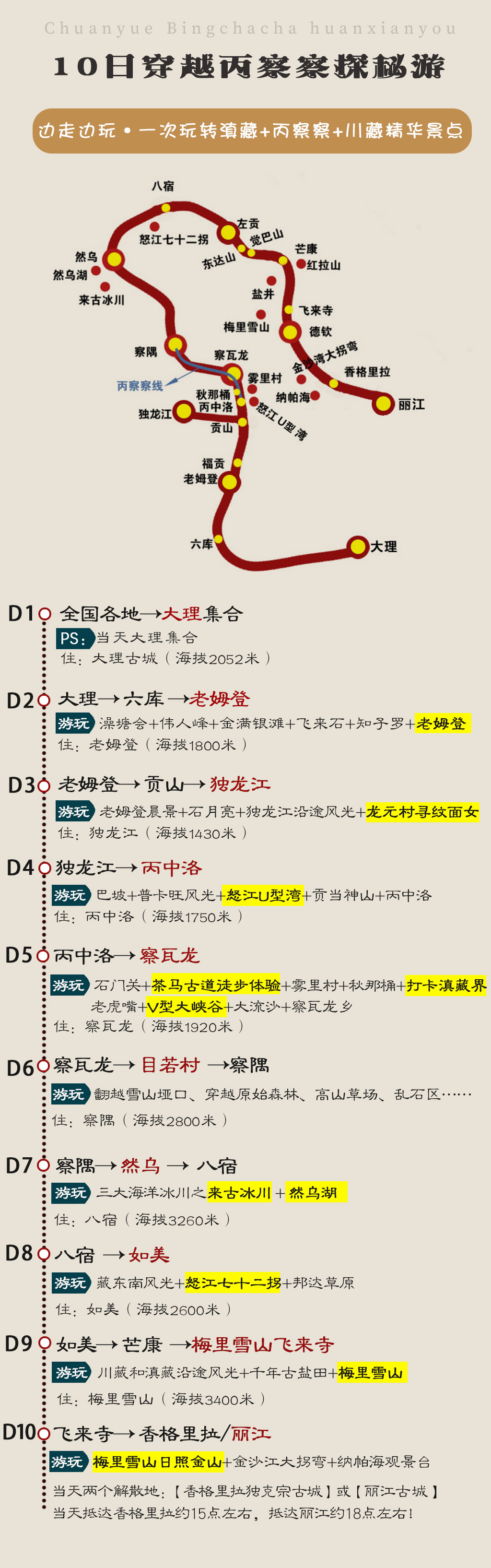 备案如下:D6察瓦龙﹣左贡,D7左贡﹣业拉山娅口﹣怒江72拐﹣来古冰川﹣然乌湖,后续行程不变。丙察左在景观度上相比丙察察略为逊色,敬请谅解。