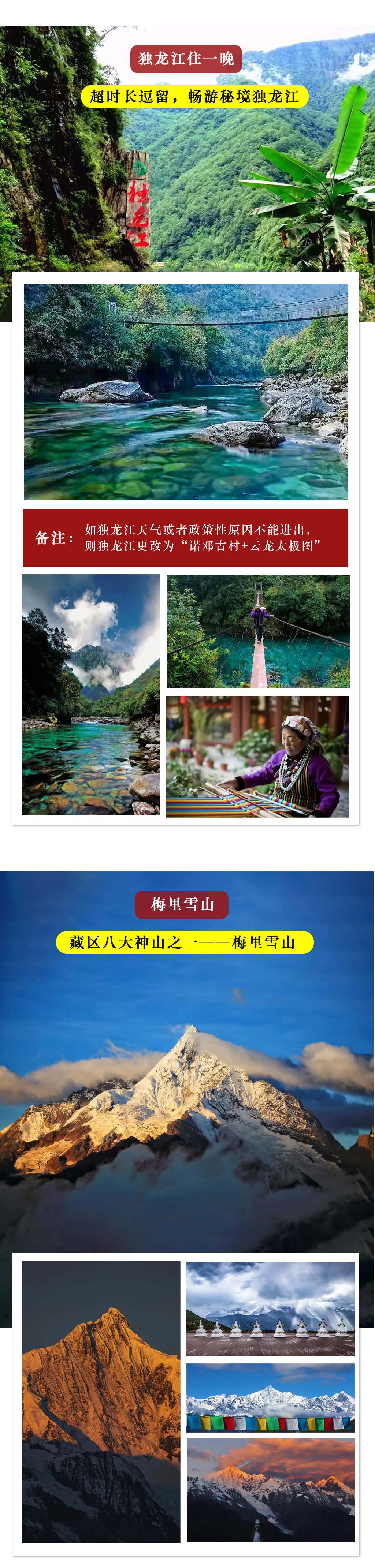 【备案说明1】若出团时独龙江因道路中断、政策等不可抗力因素关闭,则启动备案:独龙江更改为“诺邓古村+云龙太极图” ,D2大理-诺邓古村,D3诺邓-老姆登,D4老姆登-丙中洛,其他行程内容不变,费用不变。