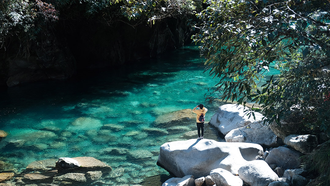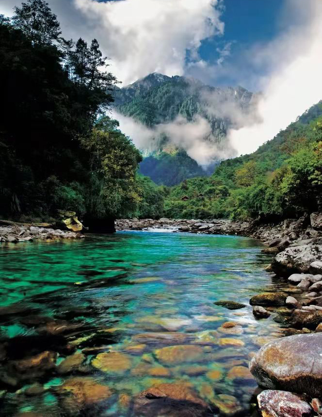 随后我们来到一独龙族村子【普卡旺村】,这里有独龙江的一条支流,这水清见底,石头挡住水流的去处激起浪花,而深处的地方则是一片翡翠,自然风光甚好,称得上人间仙境。