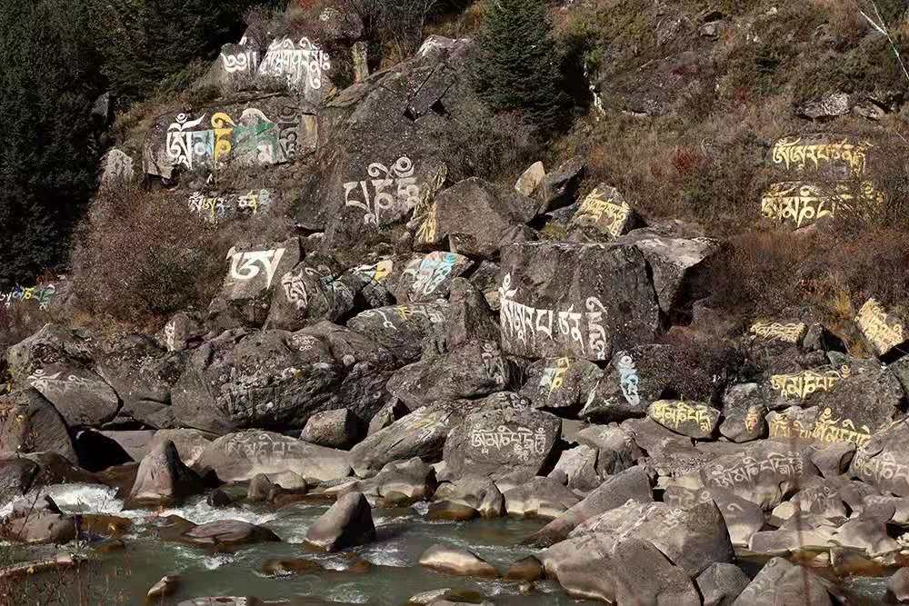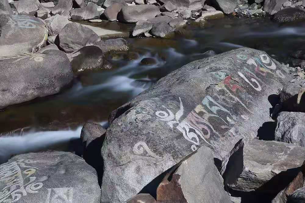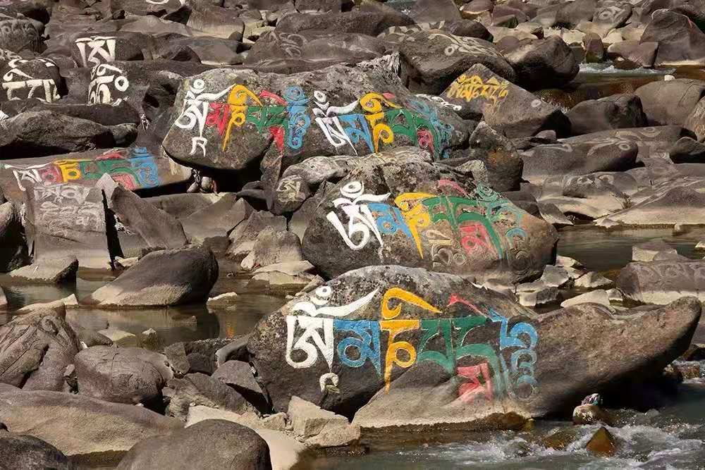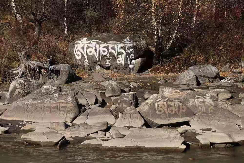这是一条流淌着“六字真言”的河,是绝对的景所罕见,世界之最,一座座以石块和石板垒成的祭坛——玛尼堆,或成堆、或独立,或白字、或彩绘,这些石块和石板上,大都刻有六字真言、慧眼、神像造像、各种吉祥图案,它们也是藏族民间艺术家的杰作。曾经在河道内冷寂的巨石洪流,被虔诚的信徒们赋予新的生命。