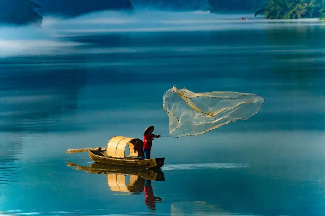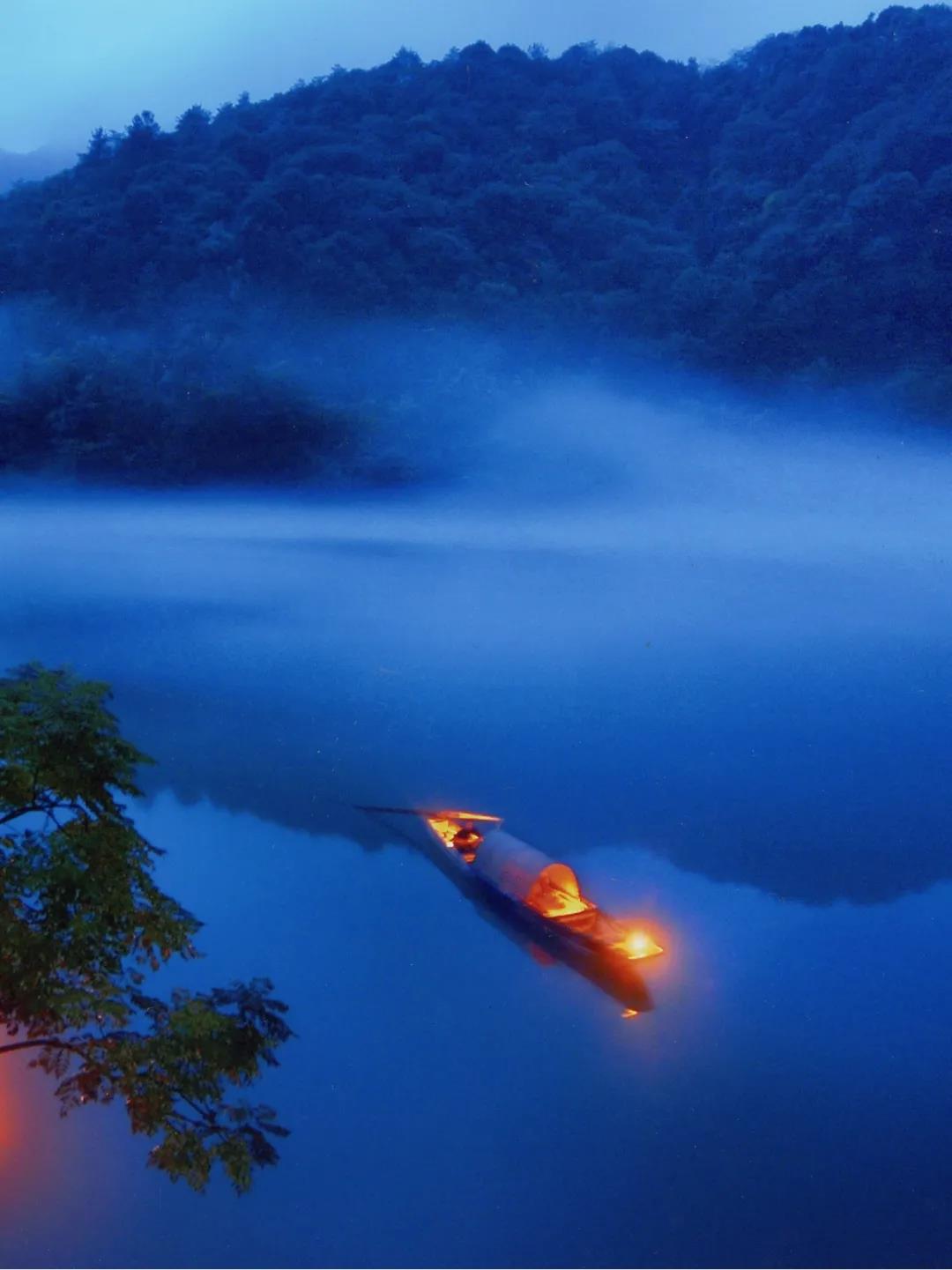 渔翁乘一叶扁舟,自雾中悠悠驶来