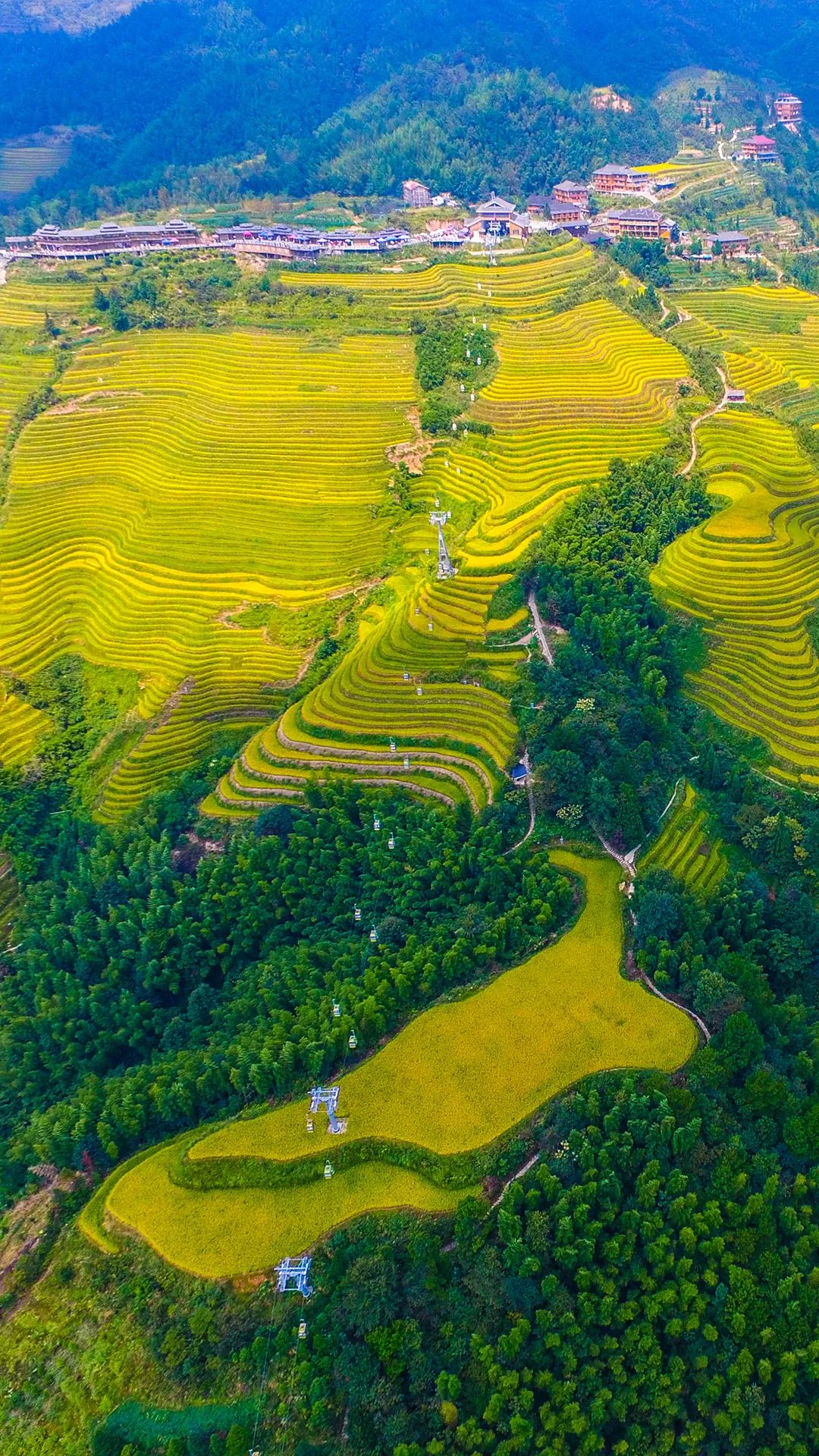 古壮寨的梯田9月中旬已成熟,最早进入金黄色的梯田
