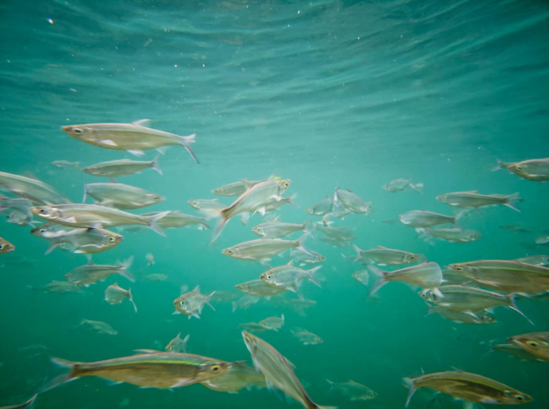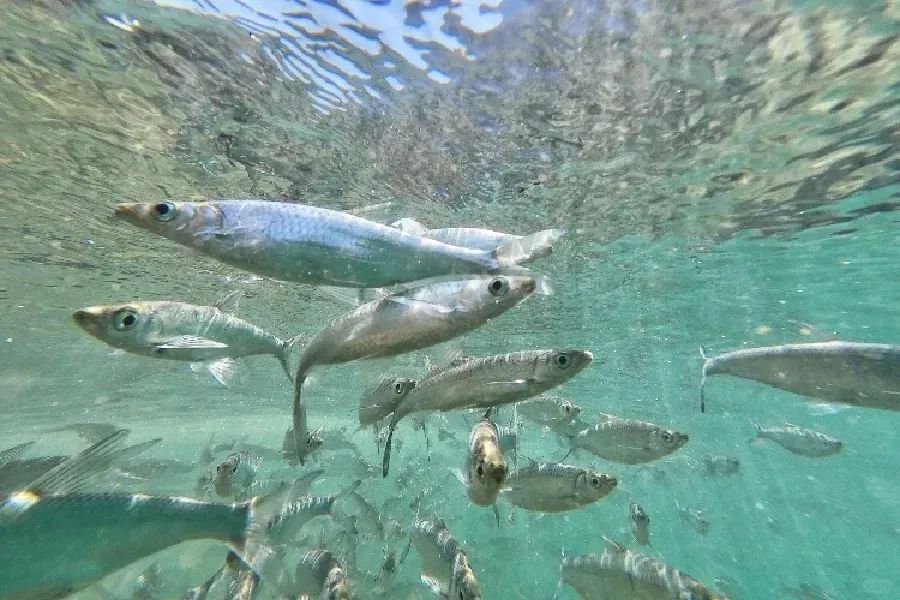 清澈河水中的蓝刀鱼群宛如水里的精灵来回游弋,