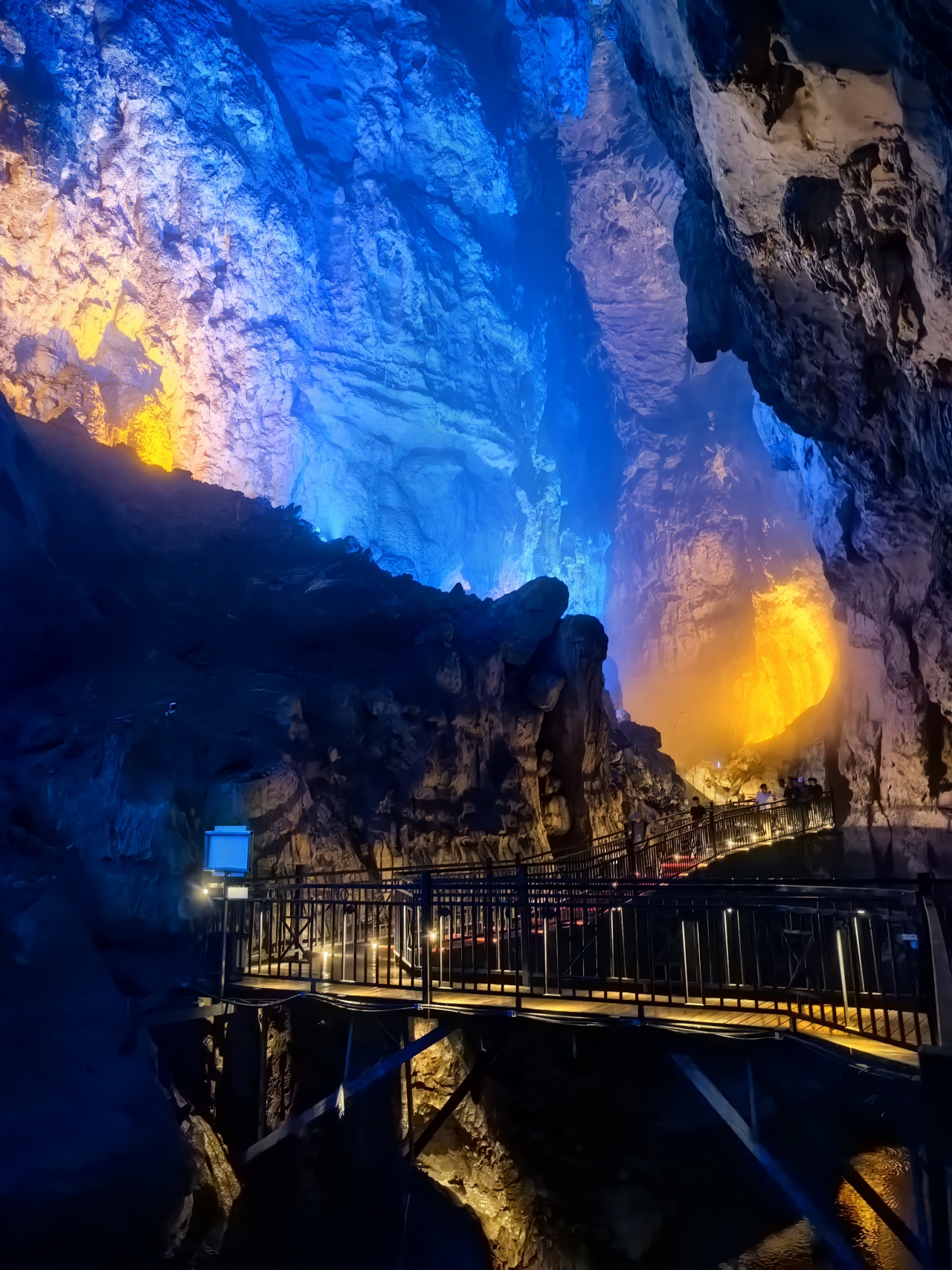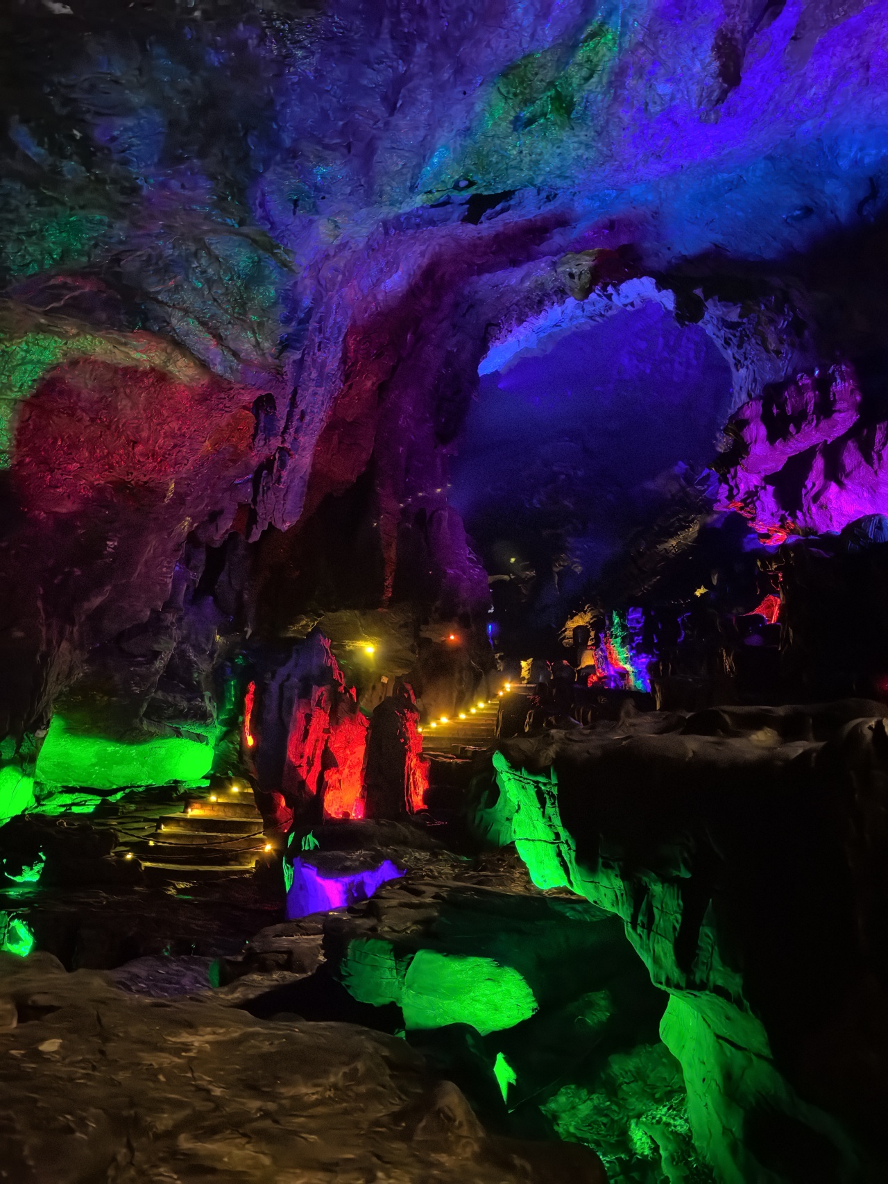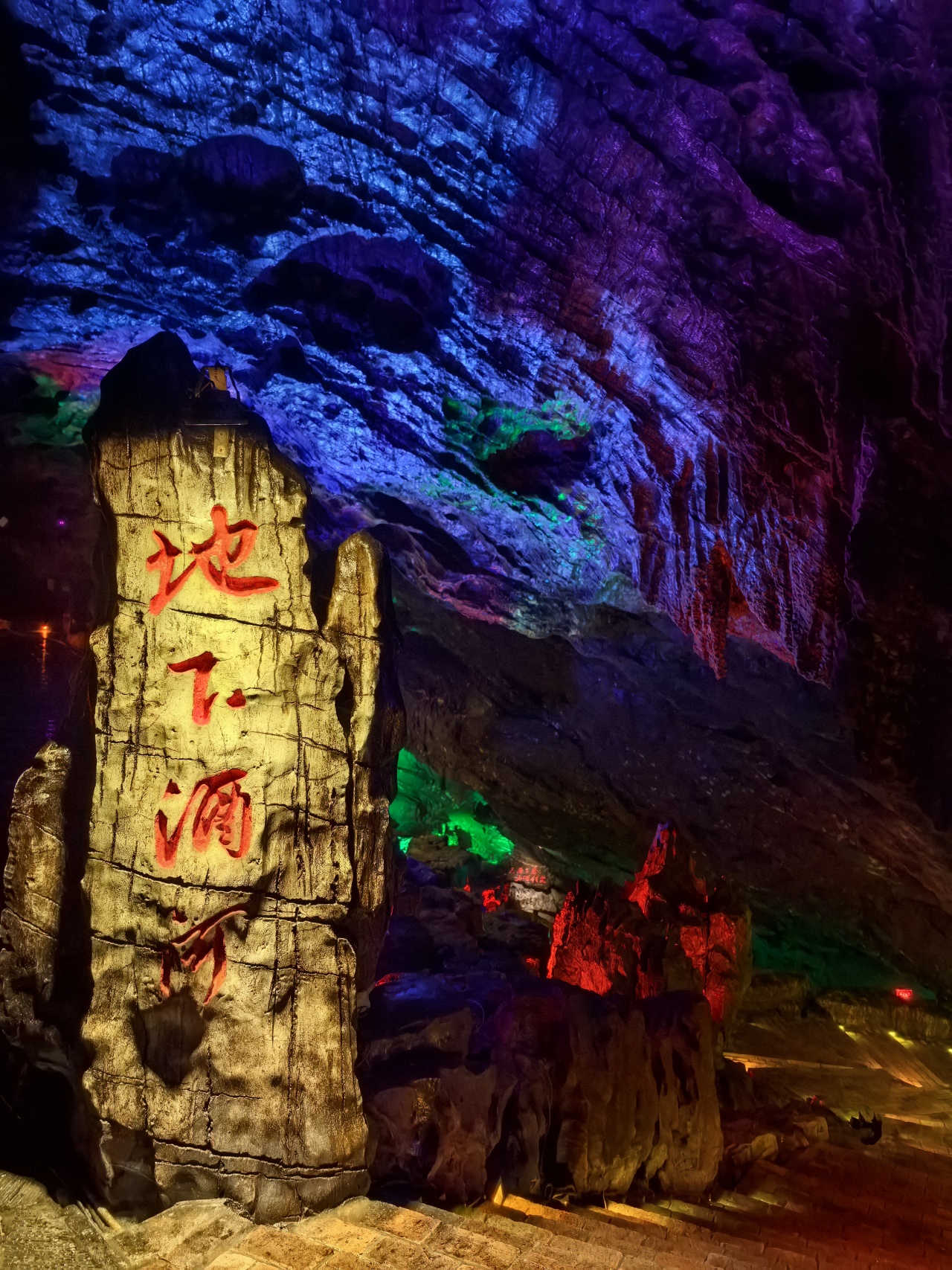 低头俯瞰,脚下是暗流涌动的地下河,清澈的河水倒映上方的钟乳石,虚实交错间更添几分神秘与幽邃。洞中恒温16℃左右,能让你在大自然的空调房中卸下一身暑气。