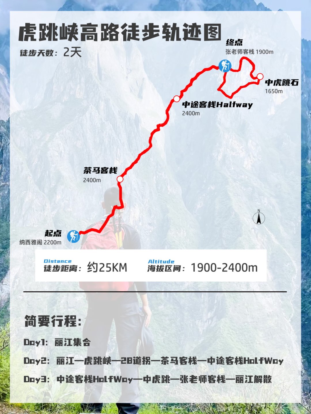 线路说明:虎跳峡高路徒步穿越属于经典入门级线路,活动强度可控,沿途后勤补给完善,线路海拔最高不超过2700米,全程无高反,老少皆宜。