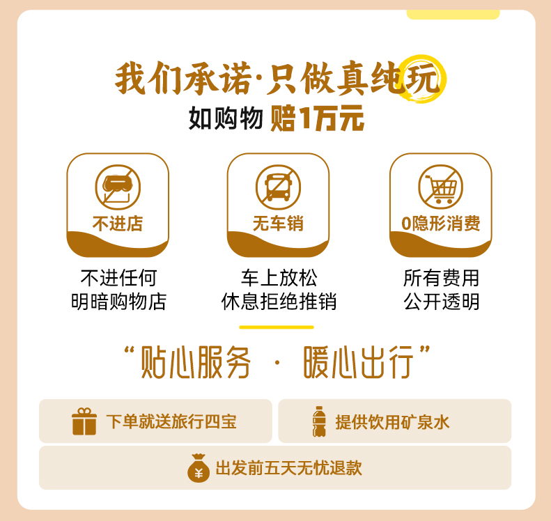10、 出游过程中,如产生退费情况,以退费项目旅行社折扣价为依据,均不以挂牌价为准。