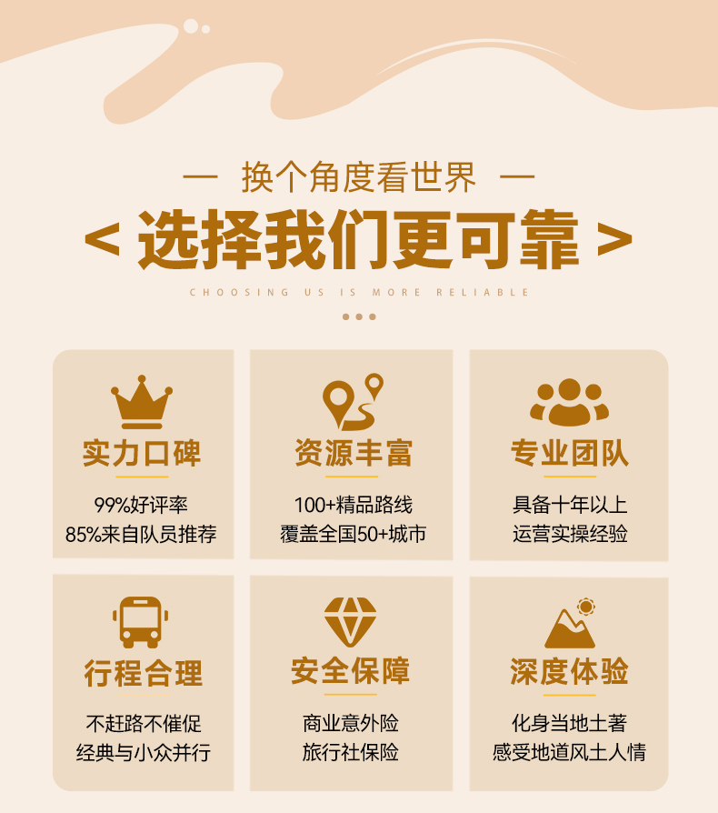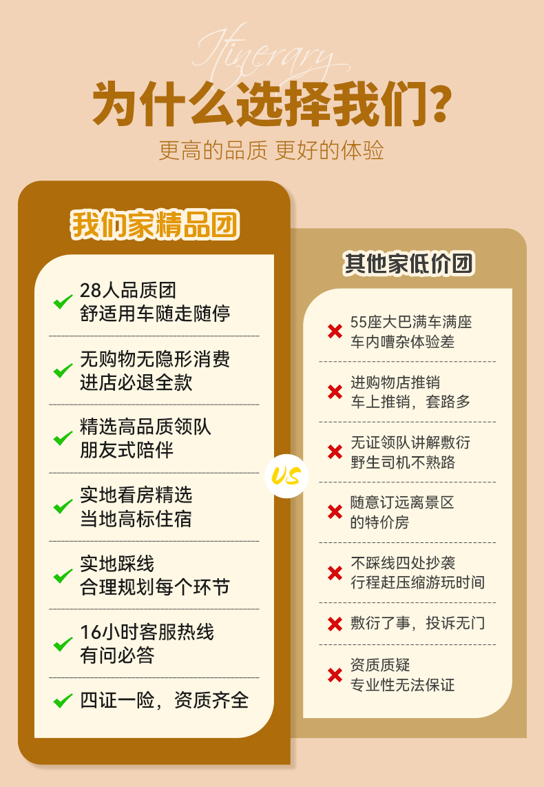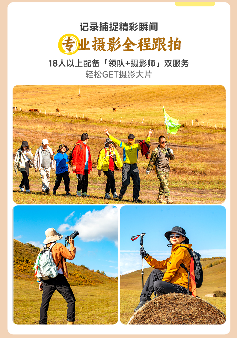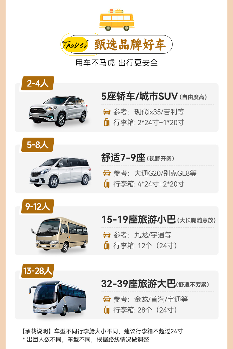 注:8人内司兼导(含8人),8人以上安排1名资深领队,18人(含18人)及以上安排摄影师跟团旅拍