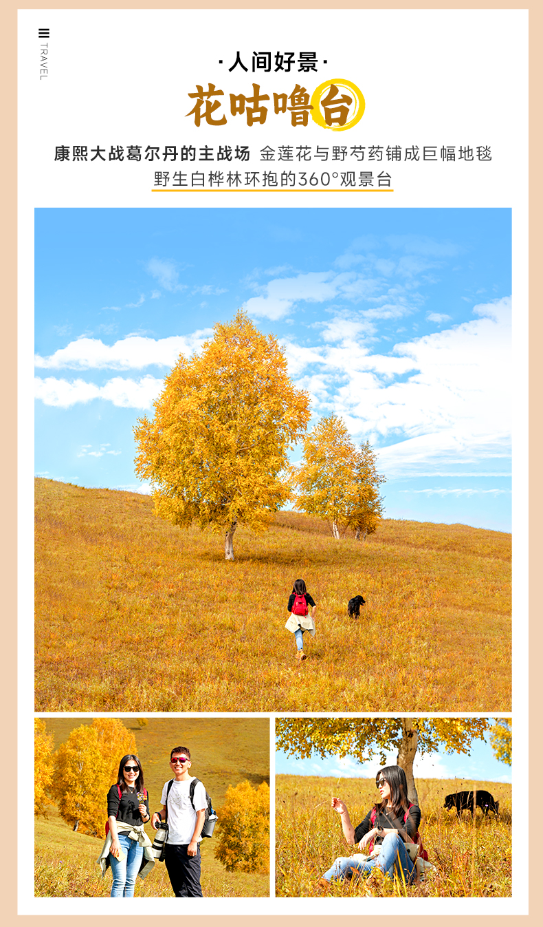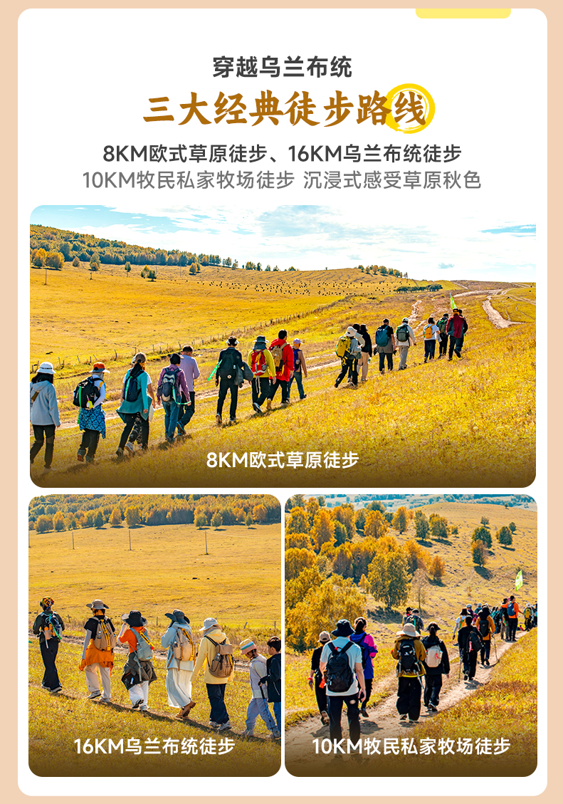 早餐后,我们收拾一下,踏上激动人心的【草原徒步挑战】(徒步全程16KM,用时约5-6h)。这里是原生态草原,途中可能会偶遇牛群、羊群,在领队带领下我们愉快地出发,一路走走停停,用相机记录每一处美丽的瞬间。在专业后勤保障越野车的保驾护航中,我们一路徒步欣赏着风景绝伦的草原风光,邂逅不一样的草原风景!沿途,我们可以以看到【花咕噜台】,这是是当年康熙大战葛尔丹主战场之一,历史遗迹如今被茫茫草地遮盖,沿途牛羊悠闲、白桦错落,田园村落若隐若现。中午到达【琪琪格湖】,享用我们徒步简餐后,赏牛羊成群的琪琪格湖美景。下午我们接着徒步至终点【葫芦诺日】,一条窄窄的小河带你走进葫芦诺日,这处隐蔽的小村庄,依旧保存着草原古朴的气质。