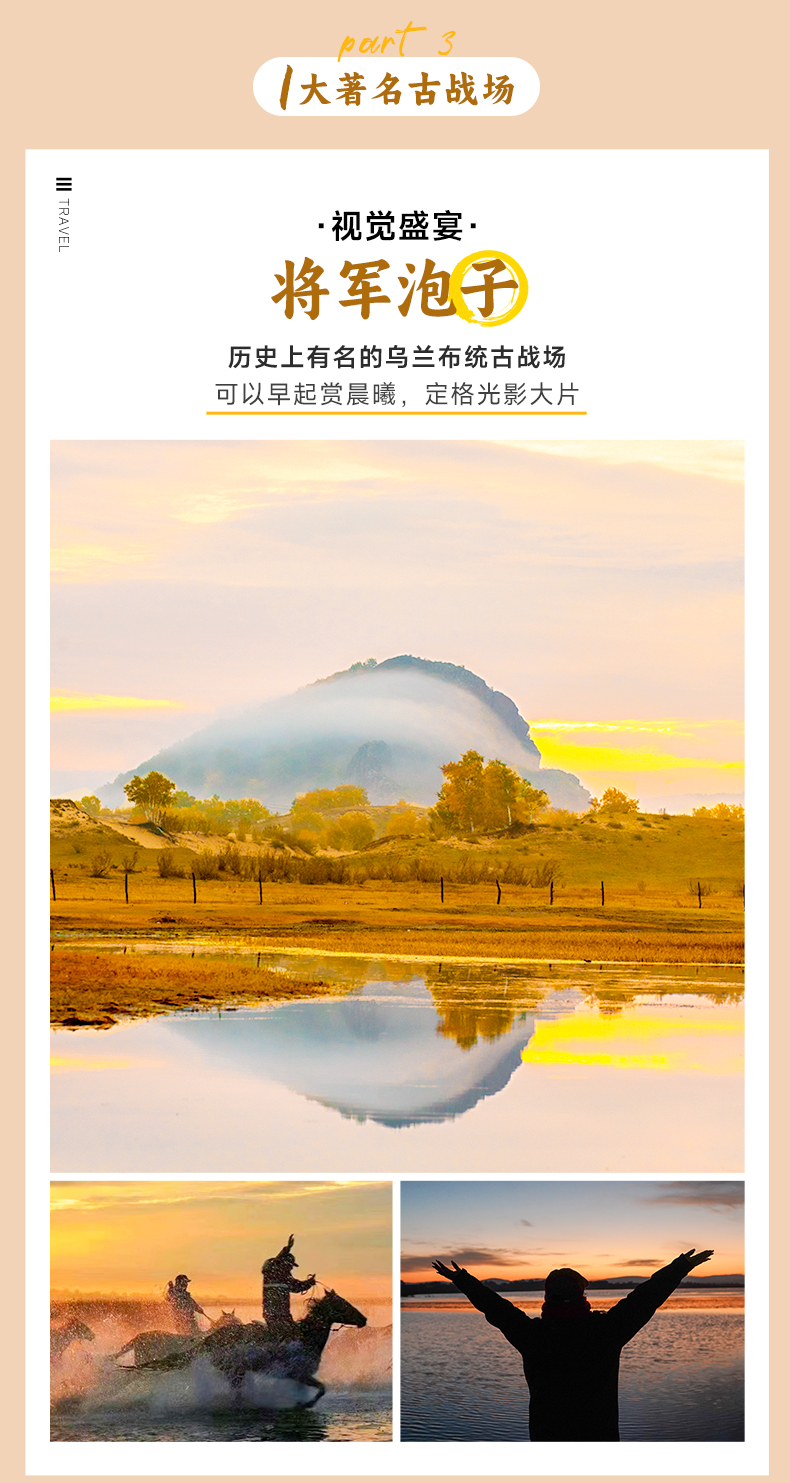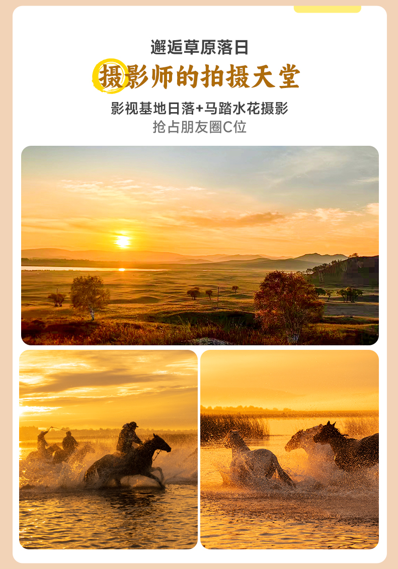 想看日出的小伙伴可以早起自行选择【将军泡子日出】/【马踏水花】;在【将军泡子】观看草原日出,静待晨曦,也可开启【马踏水花】的晨曦拍摄。天空霞光万道,群马在蒙族驭手的指挥下,像离弦的剑向湖对岸奔去,踏起的水花如一堆堆碎白玉,壮怀激烈的场面仿佛把人瞬间穿越到300多年前康熙御驾亲征,在此地与蒙古叛军葛尔丹决一死战的激烈情境。