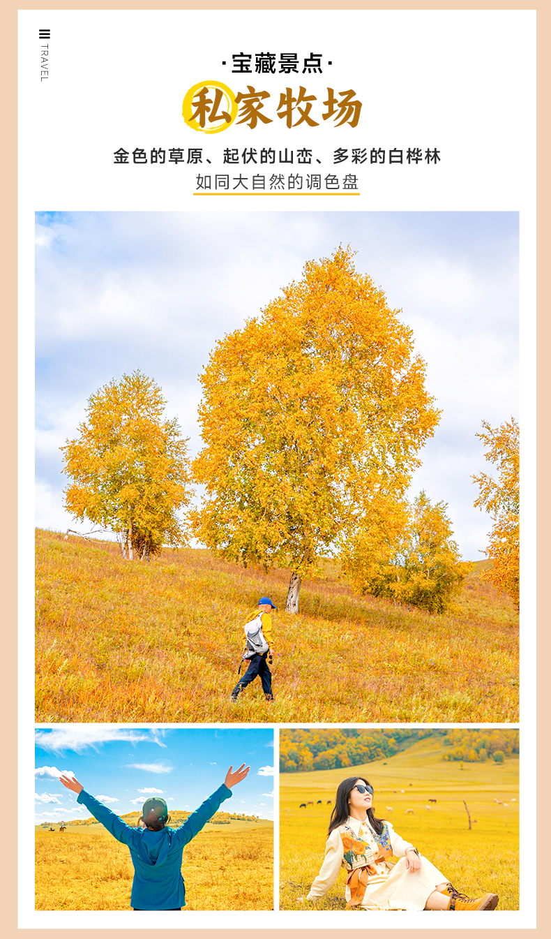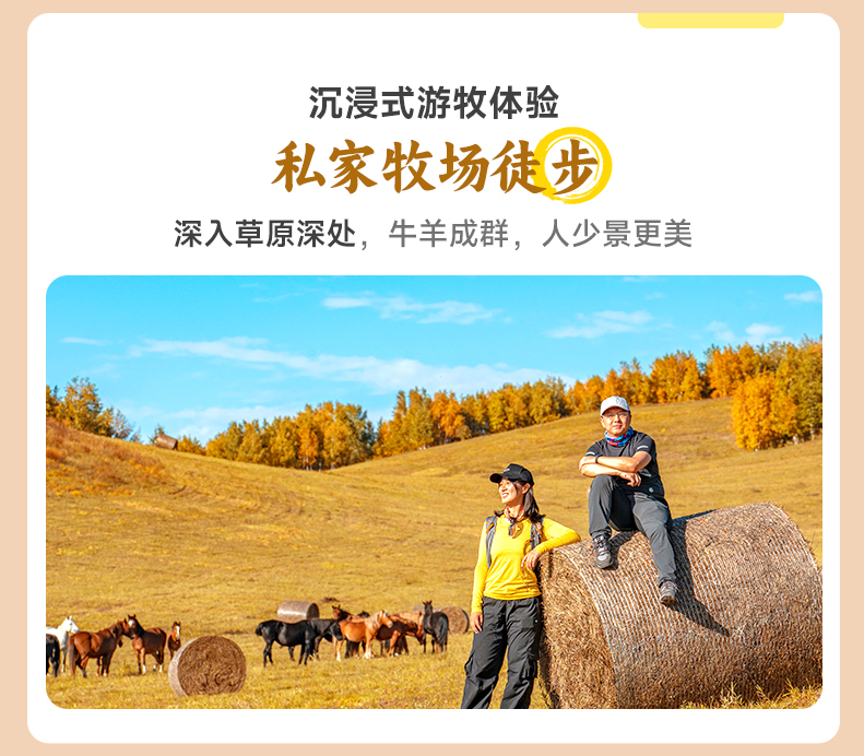 早餐后我们前往【私家牧场】(徒步全程10KM)。深入草原秘境,白桦疏林、成群牛羊交相辉映,一路风光无限。深入草原,白疏林、偶遇成群牛羊交相辉映,一路风光无限。在风景美的地方,我们可以拍照,游玩、尽情的奔跑。漫步在私家牧场,望云卷云舒,一马平川,沃野千里,在广阔的天地间追寻自由的脚步~大家可以在徒步途中或者结束后自行午餐【根据自身情况安排即可路餐需自备】