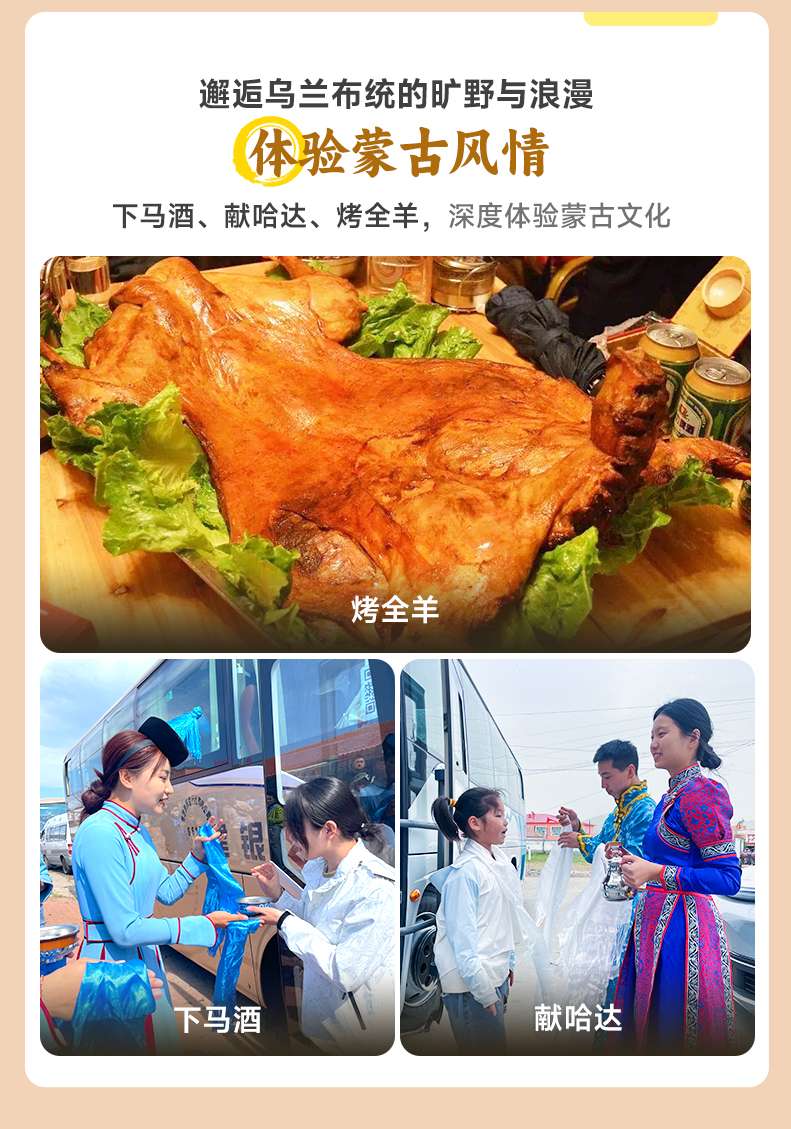 中午我们到达乌兰布统入住酒店,热情淳朴的蒙古朋友为大家准备了蒙族ZUI尊贵的迎接仪式【下马酒】【献哈达】,领队会告诉大家如何接下这份礼节,先接哈达,双手接酒,然后左手拿碗,右手无名指蘸酒,敬天、敬地、为自己祈福,之后一饮而尽。