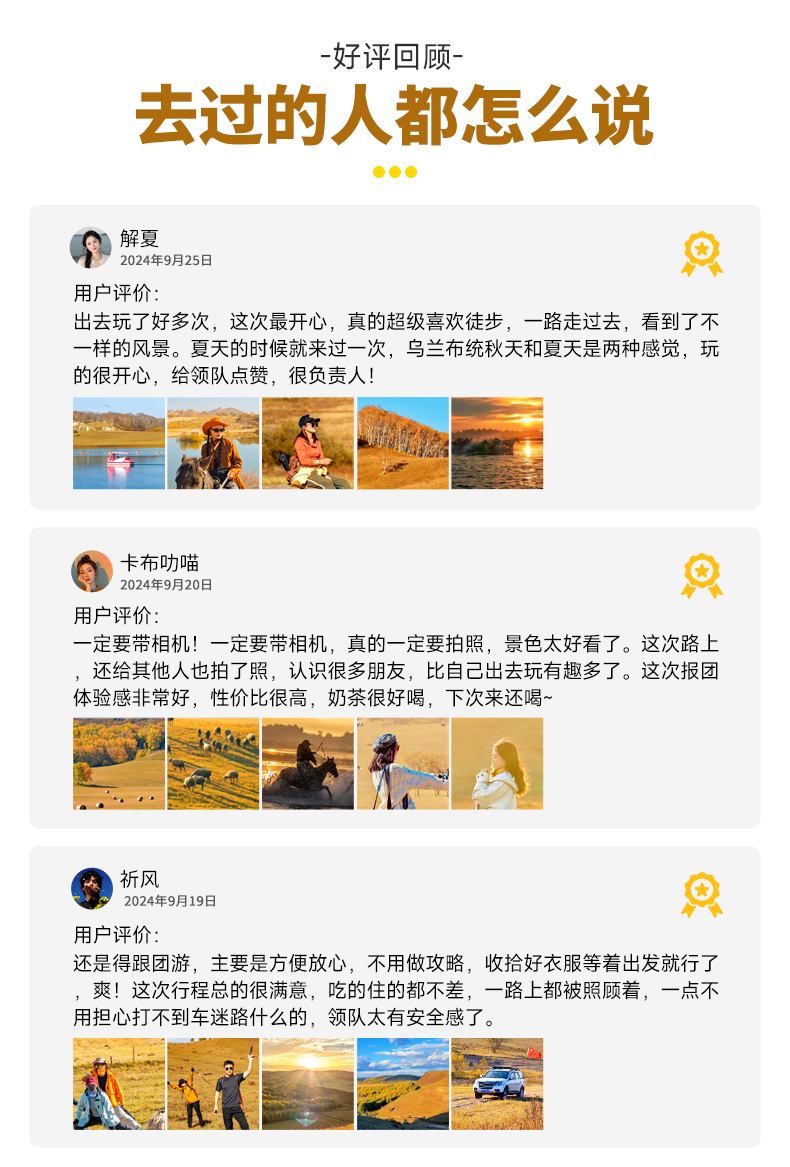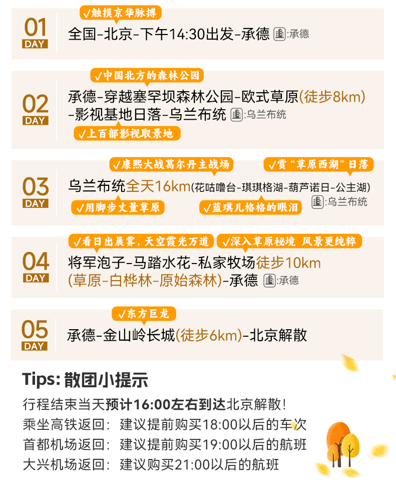 中午在景区附近自由午餐或领队组织AA吃饭下午14:00集合返京(车程约2小时)。非常幸运和大家共享草原之旅,期待我们的下次相遇,