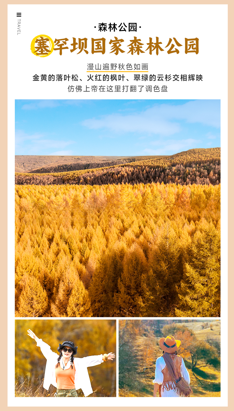 早餐后,我们乘车前往【乌兰布统】,途径【塞罕坝国家森林公园】。9月的塞罕坝落叶松,金黄的森林与草原相互映衬,薄雾若隐若现,美得如同油画一般。