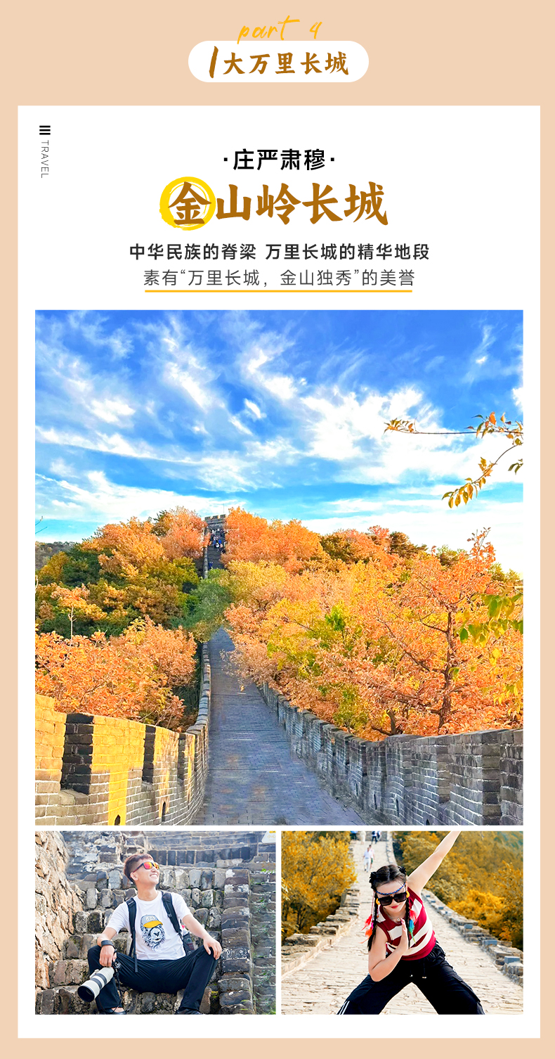 早餐后,乘车前往素有"万里长城,金山独秀”之称的【金山岭长城】(徒步全程6KM),金山岭长城始建于明洪武元年,西望古北口,东连司马台此时的金山岭长城内外百花争艳,云海飘渺浩瀚更添气势。【注意:在金山岭长城不想徒步的话也可以选择(休闲游)自行游览】