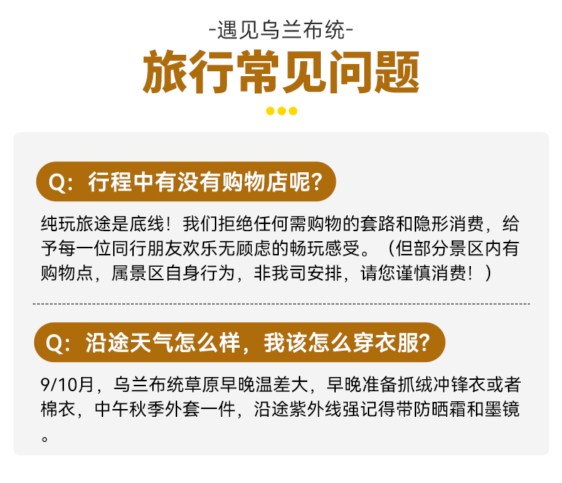 ①衣服:9/10月,乌兰布统草原早晚温差大,早晚准备抓绒冲锋衣或者棉衣,中午秋季外套一件,沿途紫外线强记得带防晒霜和墨镜。