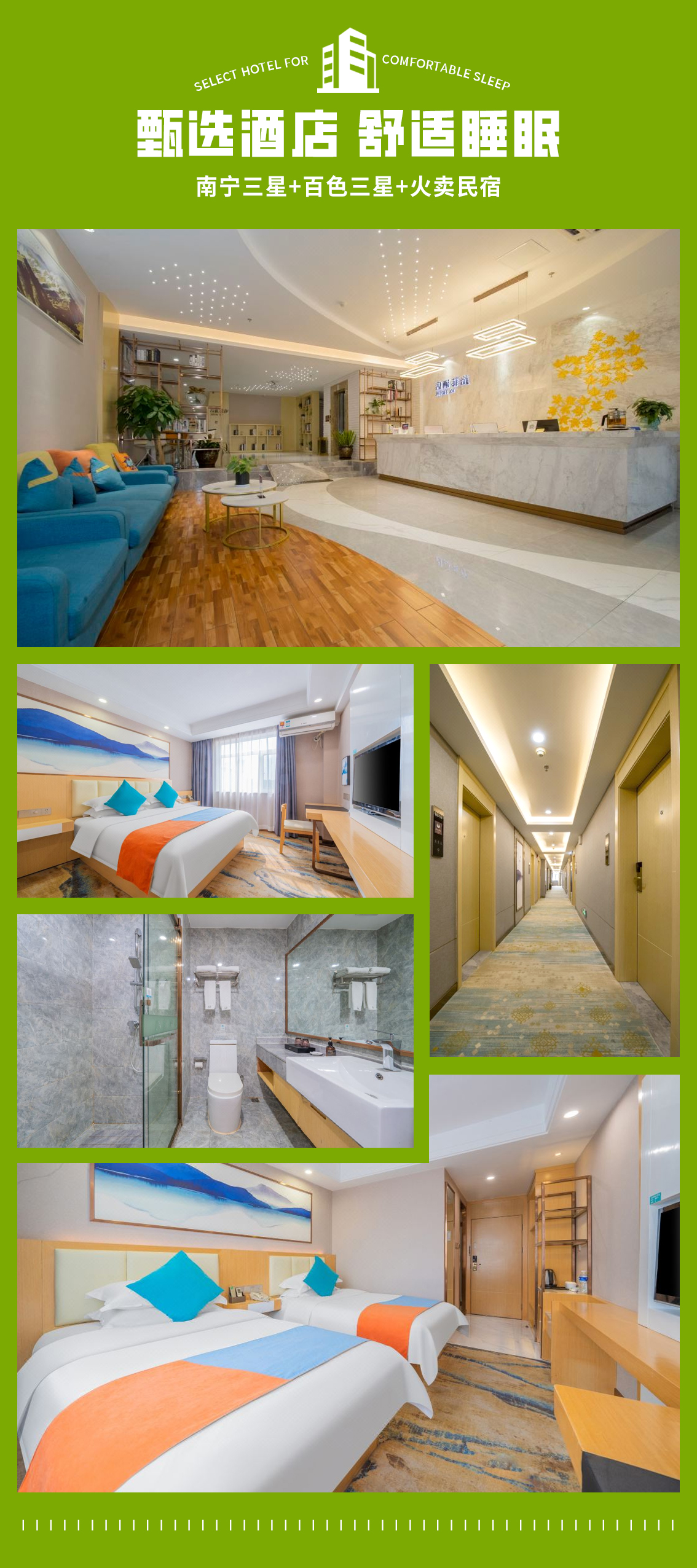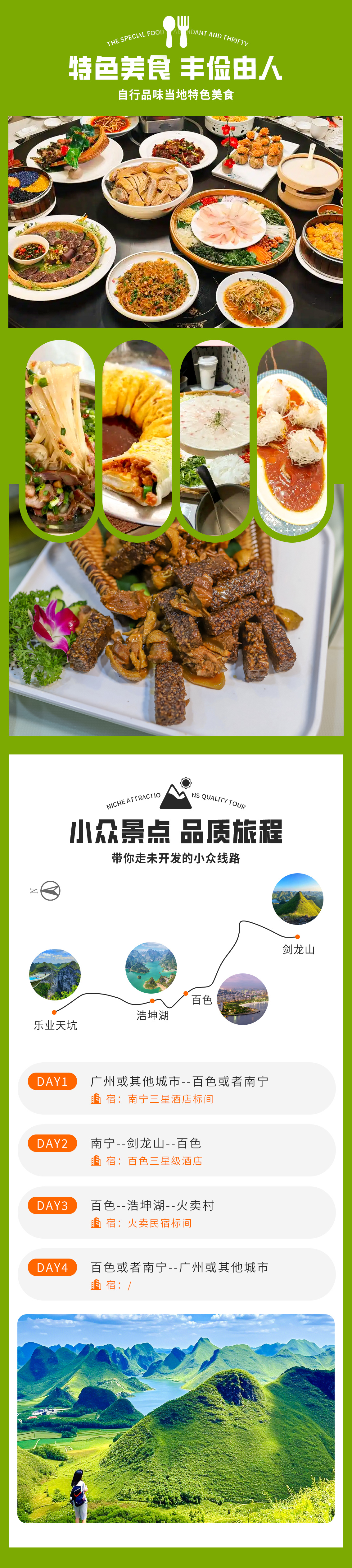 2.住宿:全程3晚酒店住宿(南宁三星,百色三星,火卖民宿),单人报名组织方优先安排同性拼,如遇到无同性法拼房平日需要补房差300元,国庆房差600元(以报名时客服相互沟通确认为准!)