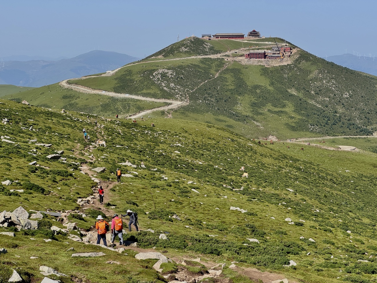 早餐后,乘坐景区区间车前往中台,开启中台至西台再抵大南庄台的徒步旅程。从中台翠岩峰出发,石阶蜿蜒穿梭于高山草原,草甸如毯铺向天际,经幡在山风里摇曳祈福。行至西台挂月峰,远眺群峰拱卫,云海翻涌时宛若仙境,古刹红墙隐现于苍翠中。下西台后向大南庄台进发,沿途可见牛羊散牧、梯田层叠,山野气息渐浓。这段徒步串联起五台山的雄奇、禅意与田园之美,让你在步履间触摸圣山的厚重,在清风中拥抱自然的灵动。。