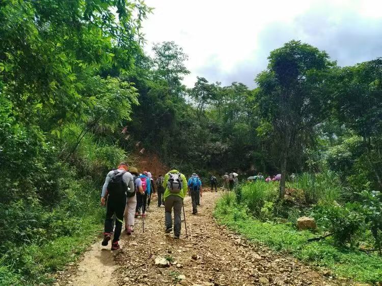 10:30 到达起点,跟着领队热身后开始徒步, 一路穿越竹林、果林、行走各种羊肠小道,翻越小山头,全程20公里左右;