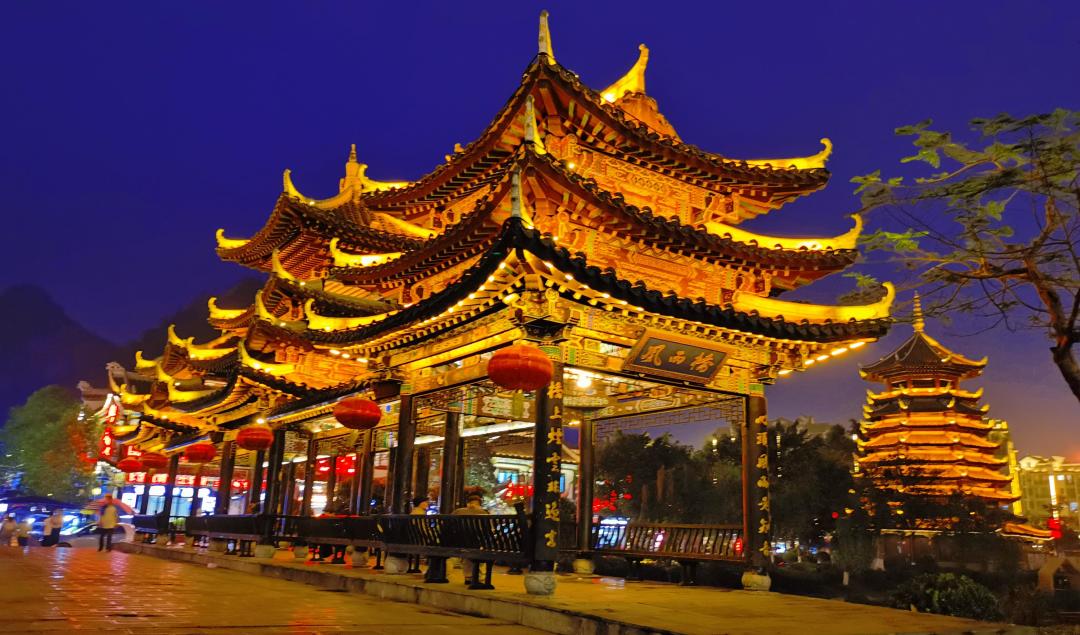 古镇上的建筑雕梁画栋,飞檐翘角,青砖黛瓦,亭台楼阁,绣球、壮锦、铜鼓等壮族元素点缀,更是锦上添花。