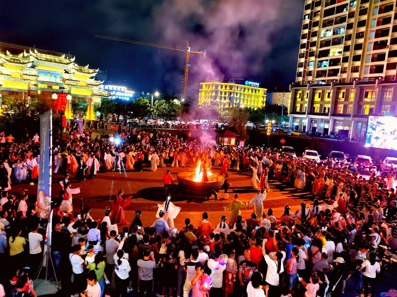 晚上在锦绣古镇的山歌广场中央熊熊篝火燃起,壮乡儿女引领游客们载歌载舞,共同度过一个难忘的夜晚。