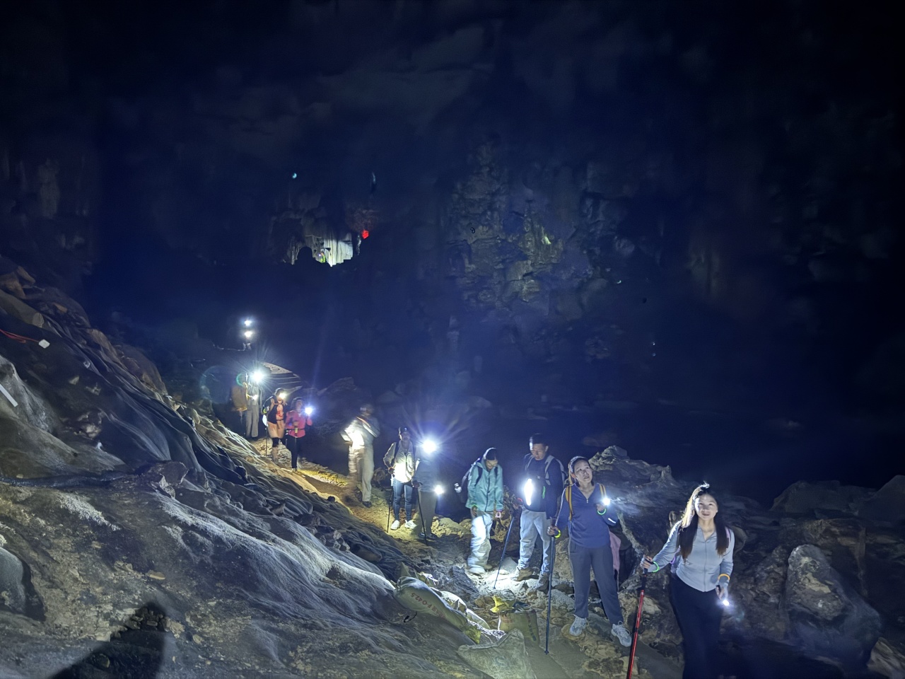 08:00徒步地心之旅。开启5小时的熊家两洞连穿,大家带上头灯,线路很成熟,地心之旅徒步大会精华段就这里。先进行一小段的登山,这个季节,最合适早起登山,今天的午餐是路餐,只能是在洞里吃,带上温水,还有干粮,一起探索神奇的天坑溶洞世界吧