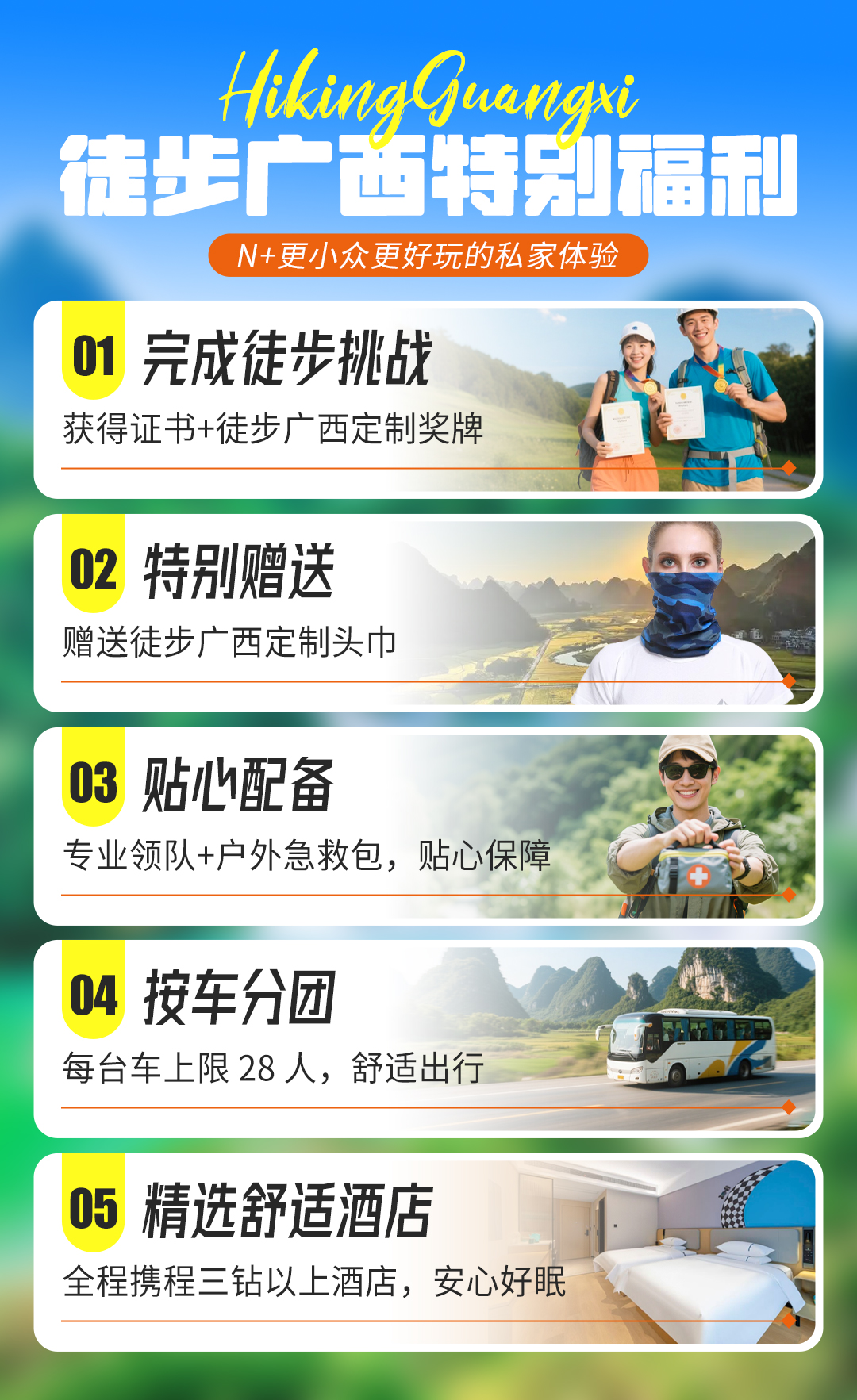 1、满2人出发,满30人有2个领队,不足30人,1个领队,本产品以徒步旅行为主,适用于6-65岁身体健康人士(如有超龄且身体状况良好,经常有户外运动可联系客服沟通确认)。