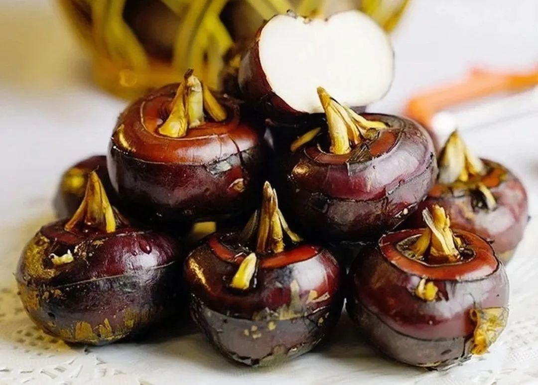 马蹄的学名叫做荸荠,也叫作水栗,是一种生活在浅水中的草本植物,因为其形状像马蹄又像栗子而得名。马蹄有像栗子一样紫黑色的外皮,剥开后肉质洁白如雪,而且汁水丰富,口感清脆香甜,正因如此也有“地下雪梨”的美誉。