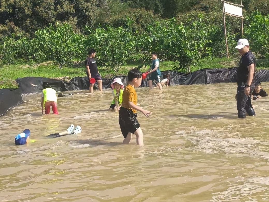 浑浊的池水就像天然隐藏滤镜,鱼儿们在里面东躲西藏,等着小渔夫们来一场盲盒式抓鱼大冒险!