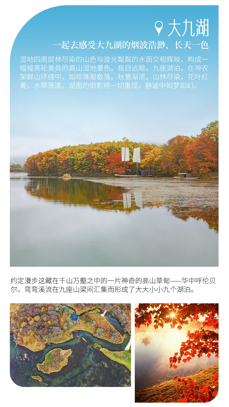 大九湖被称为华中的呼伦贝尔,是藏在千山万壑之中的一片神奇的高山草甸,弯弯溪流在九座山梁间汇集而形成了大大小小九个湖泊。