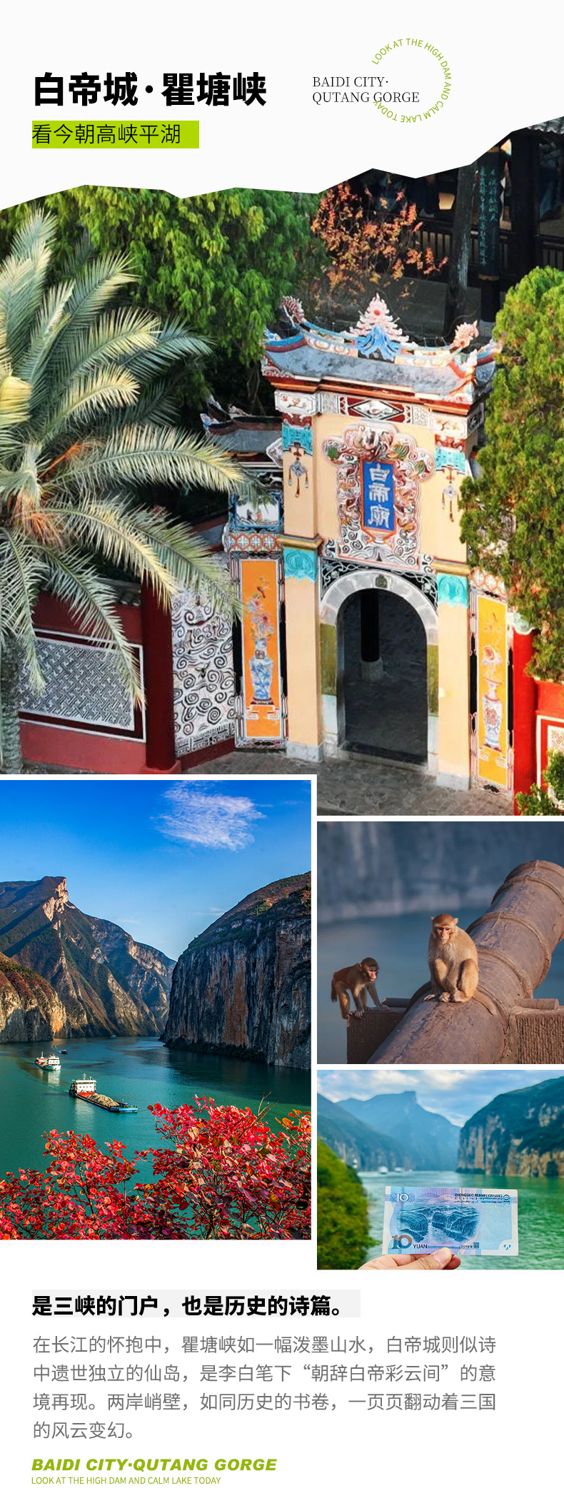 以“朝辞白帝彩云间,千里江陵一日还”的诗句而闻名于世的白帝城,位于重庆市奉节县城城东十里的白帝山上。我们将深入山间小路,拍摄瞿塘峡风光,如果你还能找到一张第五版10元人民币,别忘记带上,看看【夔门】过去和现在的变化,三峡大坝蓄水至海拔175米后,瞿塘峡已是高峡平湖,两岸险峰峻石依旧,既有满山红叶似彩霞的绚丽多姿,又有碧水荡漾、烟波浩渺的静美壮阔。
