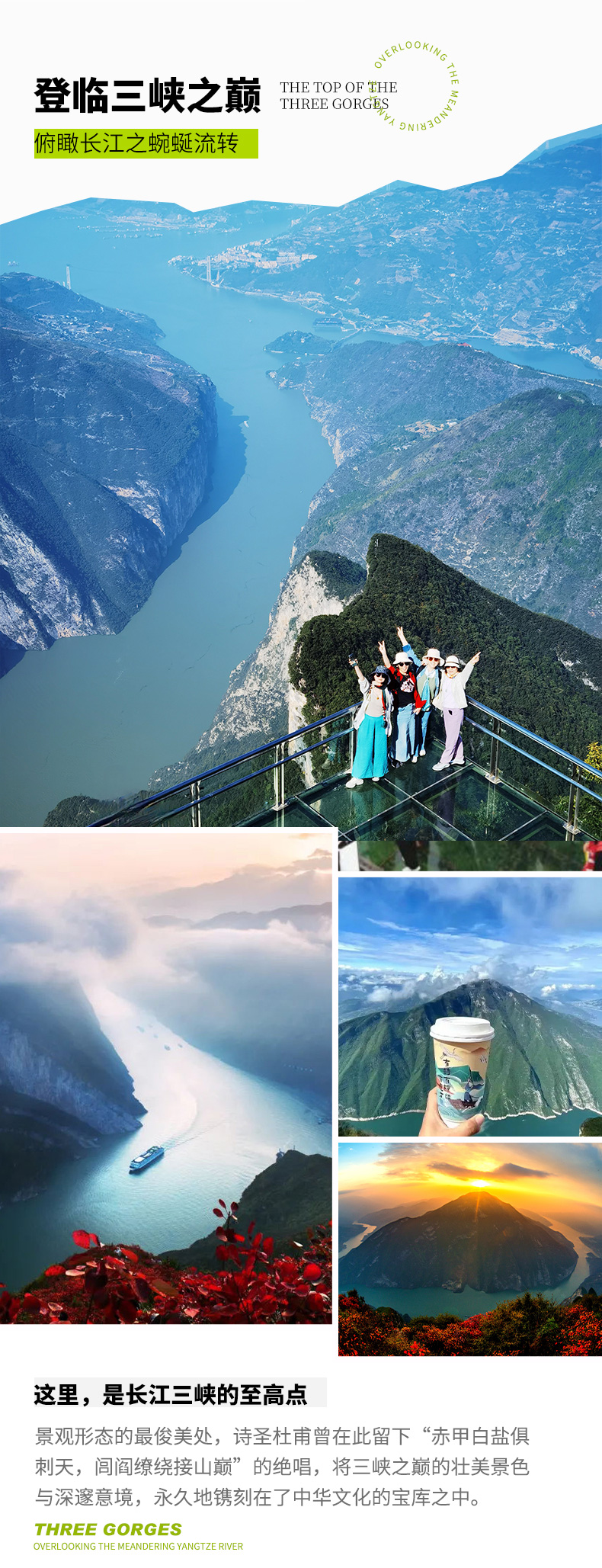三峡之巅因杜甫“赤甲白盐俱刺天,闾阎缭绕接山巅”的诗句而得名,有夔鼓神坛、四望乐坛、音祖雕像、夔字门、竹律雅欄、迎龙台等景点。这里是三峡的制高点,我们将在这里俯瞰瞿塘峡全景,观长江的壮美,以及群山的拥簇。