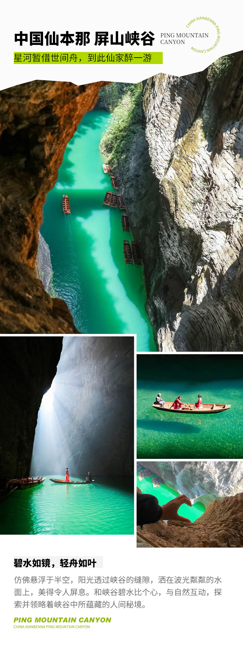 屏山峡谷被誉为“中国仙本那”,这里是恩施旅游必览之地。屏山四周峭壁悬空,碧水环绕,青 山翠绿,在峡谷中的水面游弋,抬头看去,四周峭壁耸立,溪流环绕。
