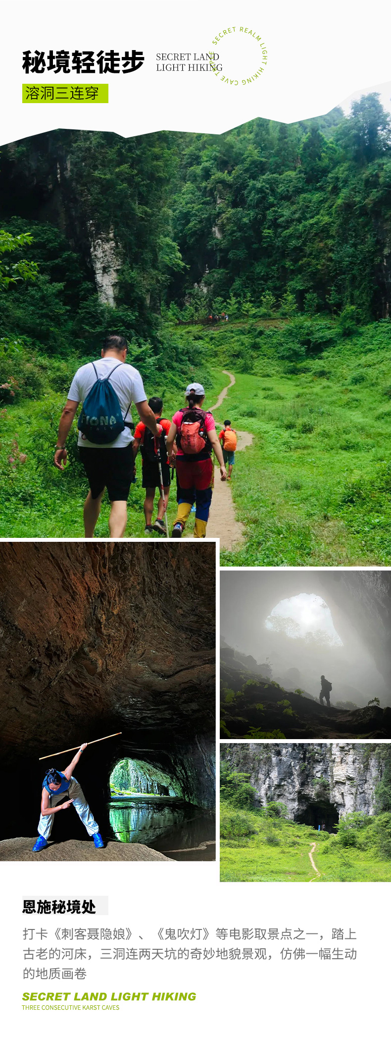 只游玩最经典路段,全程大概4km。如因为下雨天气,导致山洞路段积水严重,则更换为龙船水乡。
