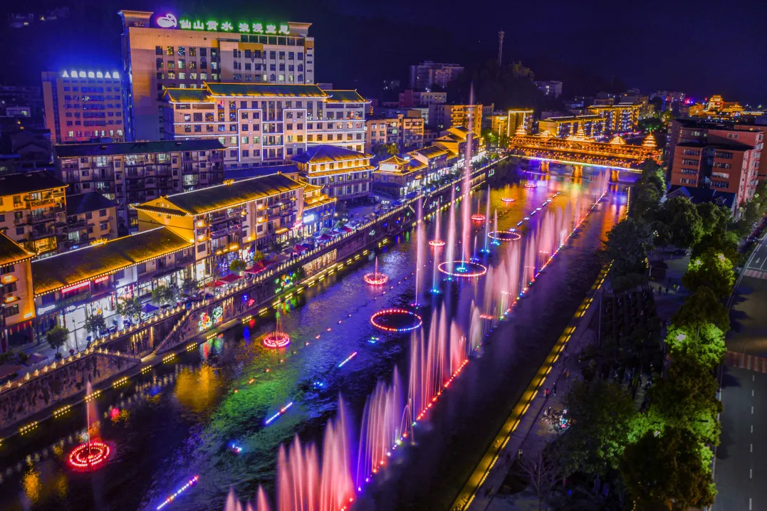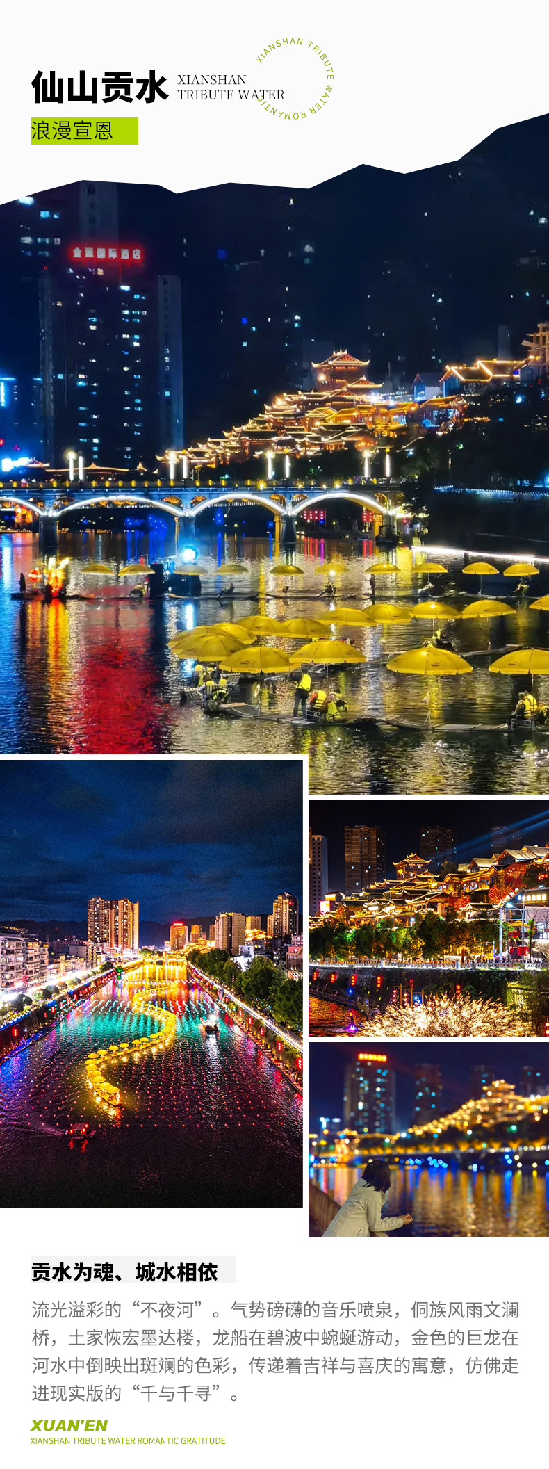 在宣恩这个浪漫小城,一河两岸,灯光璀璨,半城烟火半城仙。国内最长的音乐跑泉在此欢快跳跃,宛如仙女的丝带在空中舞动。晚上去体验特色宣恩烤活鱼,再漫步贡水河畔,走上风雨文澜桥,感受恩施小洪崖洞浪漫夜景。