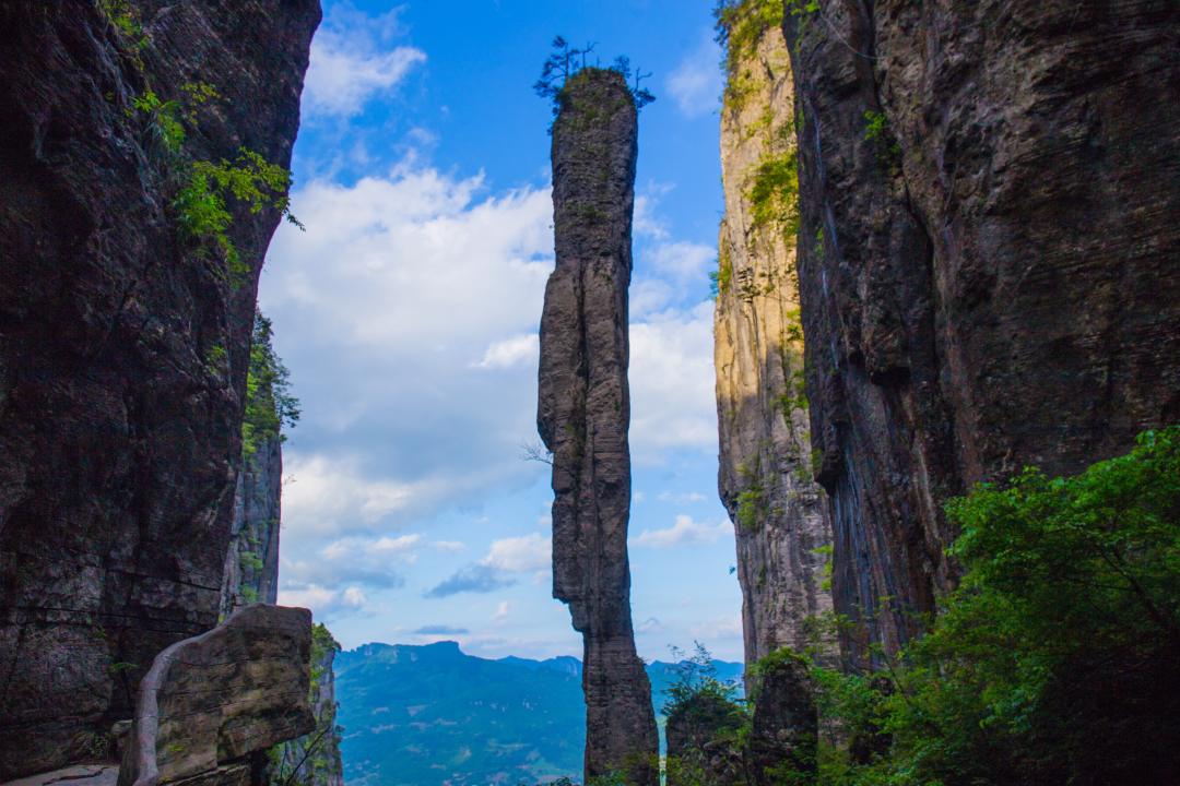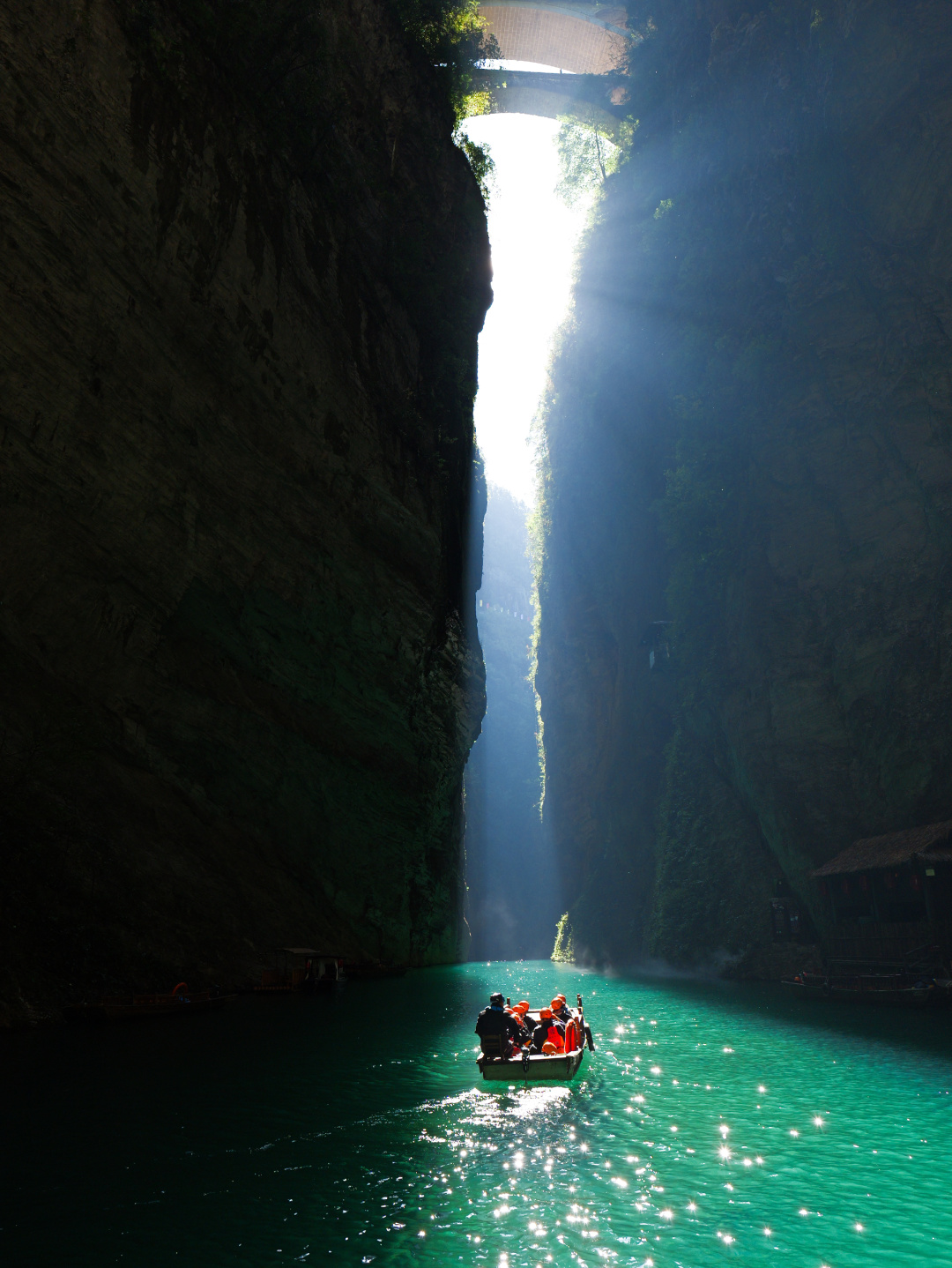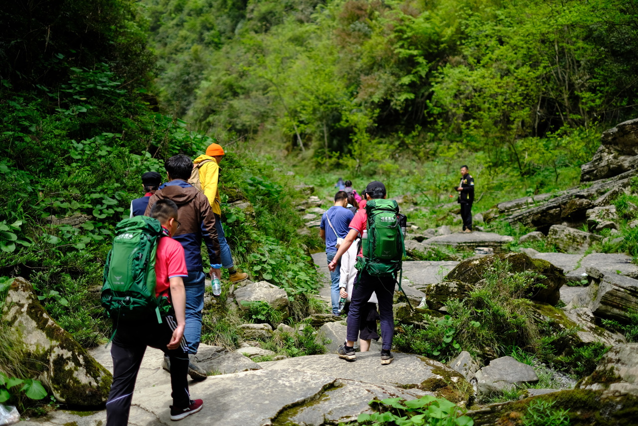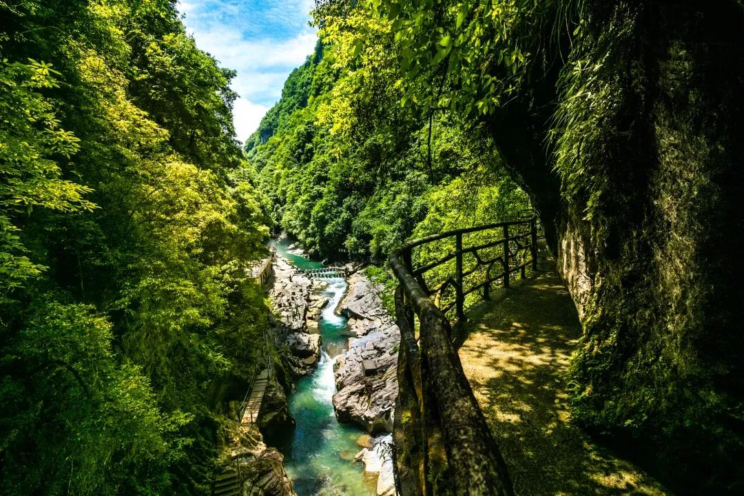 沿着依山而开的栈道前行,或穿行于蜿蜒的石阶小路之间,面前一座座山峰层层叠叠,或庞大稳重,屹立不倒;或壁如刀削,直耸云端。在这一段峡谷里旅行,伸手可及石壁,石壁上的连绵青苔,碧绿柔软;栈道下的河水,浪花雪白;回水潭里的莹莹碧水,澄澈明净。