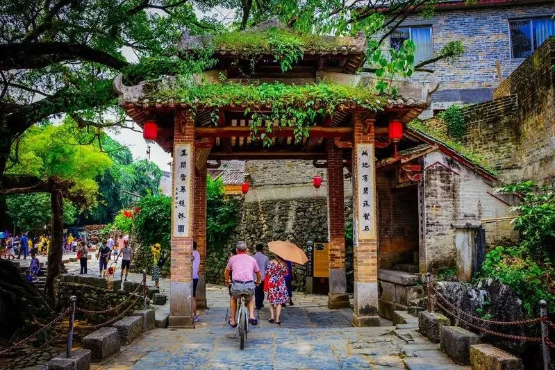 想免票的需要清晨在检票员上班前进入古镇,穿过门楼,门里门外皆为石板街。这里都是上百年的老街,块块石板,泛出亮光,平滑如镜。来到带龙桥,此处风景幽美,吸引了众多镜头和画者,电影《面纱》就曾在此取景。一切的景色画面,若隐若现,仿佛穿越时空,这种古朴、清凉、悠远。古镇上有好几处跳跳桥,也是镇上人们的“交通要道”,也是驴友的摄影好去处。