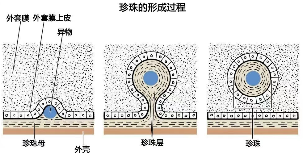 河蚌在河里生活时,偶然会有一些寄生虫或砂粒夹在外套膜与贝壳之间,这时外套膜的表皮细胞受到刺激,就会急剧地分泌出珍珠质,将砂粒或寄生虫包围住,构成完整的珍珠囊;珍珠质不断累积,最后便成为闪闪发亮的珍珠。