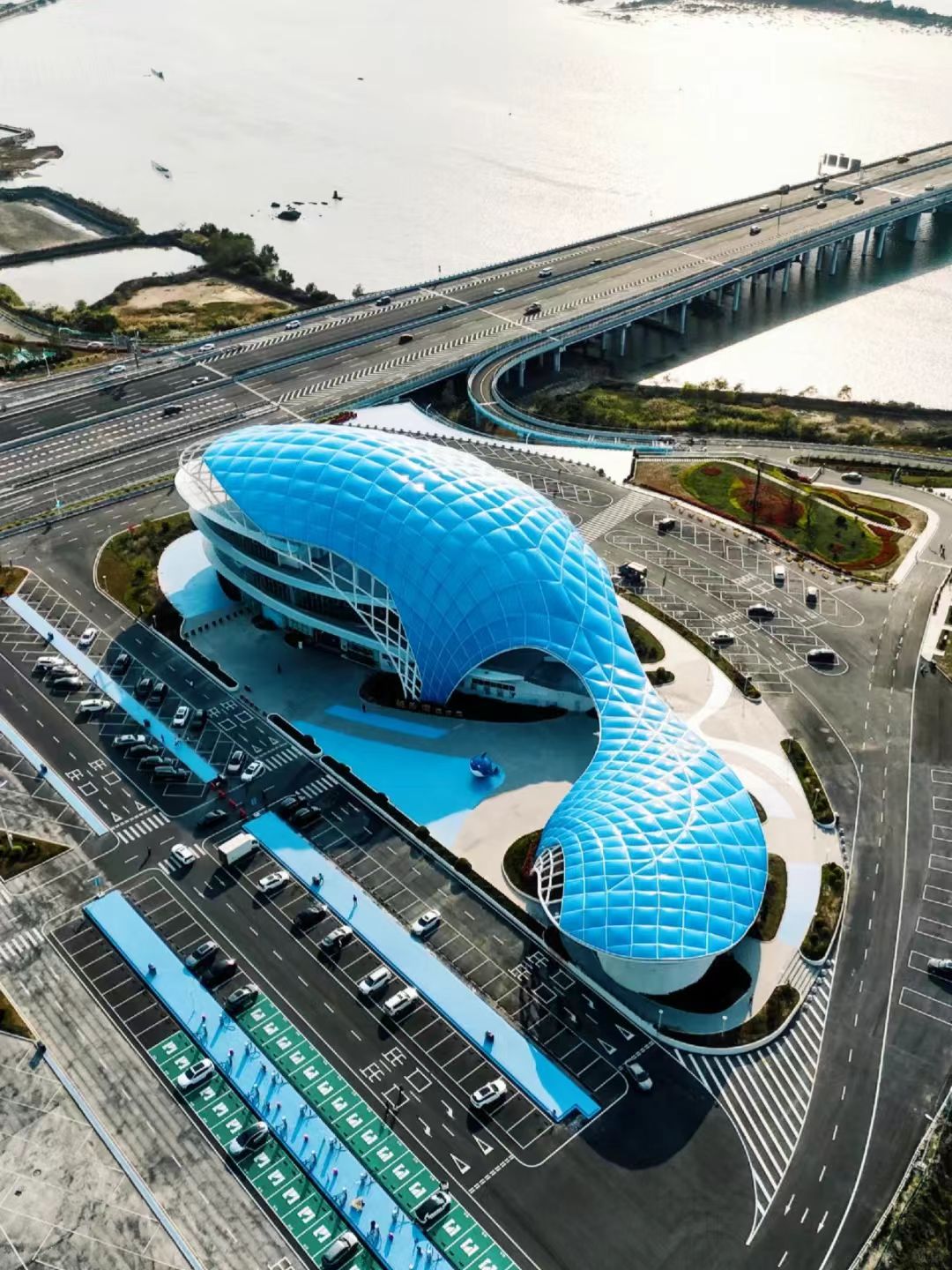 长沙湾服务区位于汕尾市,是粤东最大,且唯一一个展现海洋地域文化的服务区,充分融入汕尾海陆丰文化及交通建筑特色,以汕尾海洋文化的潮水、海鸟为寓意,以“鱼跃深汕西、逐浪长沙湾”为主题,提取海洋文化“鱼跃”意象,精心规划建设海洋文化展厅、海鲜集市与农文旅展销平台等,打造出独具特色的粤东海洋风情服务区。